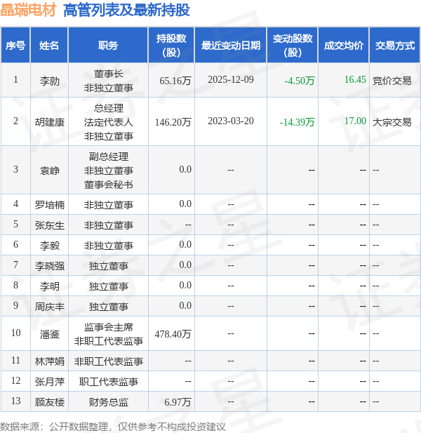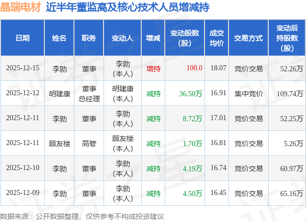 证券之星消息,根据12月16日市场公开信息、上市公司公告及交易所披露数据整理,晶瑞电材(300655)最新董监高及相关人员股份变动情况:2025年12月15日公司董事李勍共增持公司股份100.0股,占公司总股本为0.0001%。变动期间公司股价下跌0.06%,12月15日当日收盘报17.77元。