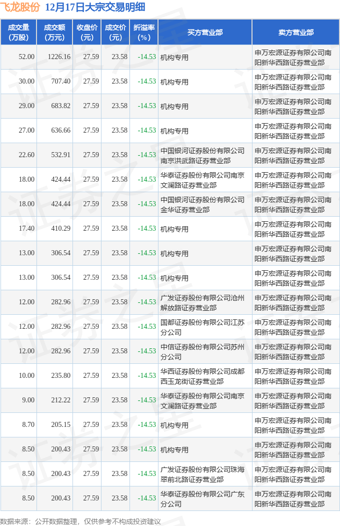 证券之星消息,12月17日飞龙股份发生大宗交易,交易数据如下: