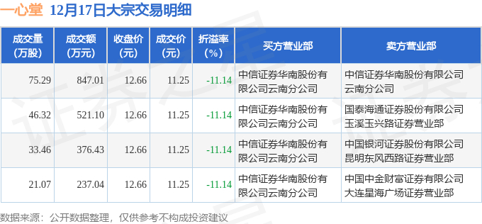 证券之星消息,12月17日一心堂发生大宗交易,交易数据如下: