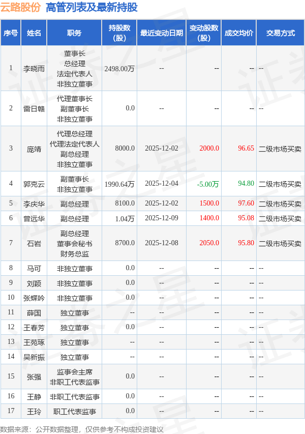 证券之星消息,根据12月17日市场公开信息、上市公司公告及交易所披露数据整理,云路股份(688190)最新董监高及相关人员股份变动情况:2025年12月16日公司董事,高级管理人员庞靖、高级管理人员李庆华共增持公司股份2350.0股,占公司总股本为0.0019%。变动期间公司股价下跌2.52%,12月16日当日收盘报96.55元。