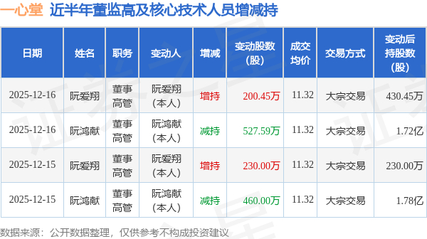 一心堂近半年内的董监高及核心技术人员增减持详情如下: