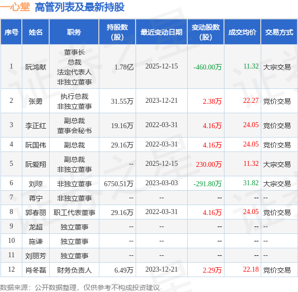 一心堂的高管列表及最新持股情况如下: