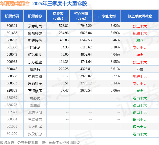 根据2025基金Q3季报公募基金重仓股数据,重仓该股的公募基金共3家,其中持有数量最多的公募基金为华夏基金的华夏稳增混合。华夏稳增混合目前规模为12.0亿元,最新净值3.509(12月17日),较上一交易日上涨0.37%,近一年上涨42.7%。该公募基金现任基金经理为彭海伟。彭海伟在任的基金产品包括:华夏景气成长一年持有混合发起式A,管理时间为2024年3月28日至今,期间收益率为50.66%。
