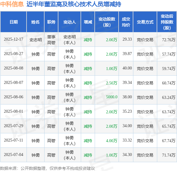 中科信息近半年内的董监高及核心技术人员增减持详情如下:
