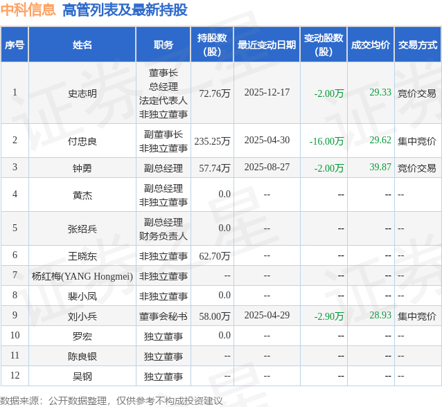 中科信息的高管列表及最新持股情况如下: