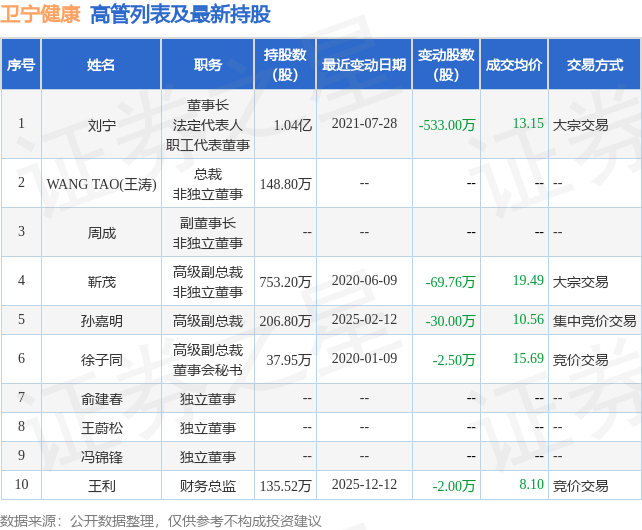 卫宁健康近半年内的董监高及核心技术人员增减持详情如下: