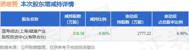 证券之星消息,12月22日诺唯赞发布公告《诺唯赞:诺唯赞关于持股5%以上股东权益变动触及1%刻度的提示性公告》,其股东国寿成达(上海)健康产业股权投资中心(有限合伙)于2025年11月12日至2025年12月19日间合计减持318.58万股,占公司目前总股本的0.801%,变动期间该股股价下跌14.87%,截止12月19日收盘报20.15元。