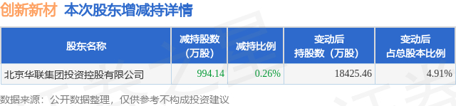 证券之星消息,12月22日创新新材发布公告《创新新材:关于持股5%以上股东减持至5%以下的权益变动提示性公告》,其股东北京华联集团投资控股有限公司于2025年12月19日至2025年12月22日间合计减持994.14万股,占公司目前总股本的0.2647%,变动期间该股股价上涨2.14%,截止12月22日收盘报4.29元。