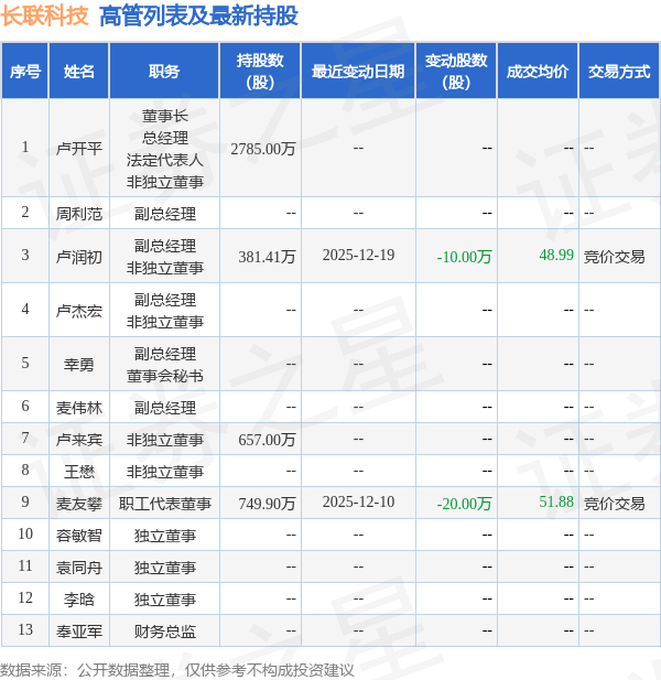 长联科技的高管列表及最新持股情况如下: