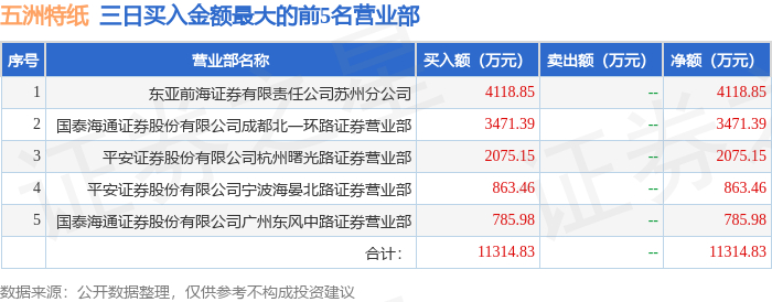 证券之星消息,沪深交易所2025年12月25日公布的交易公开信息显示,五洲特纸(605007)因非ST、*ST和S证券连续三个交易日内收盘价格涨幅偏离值累计达到20%的证券登上龙虎榜。此次是近5个交易日内第1次上榜。
