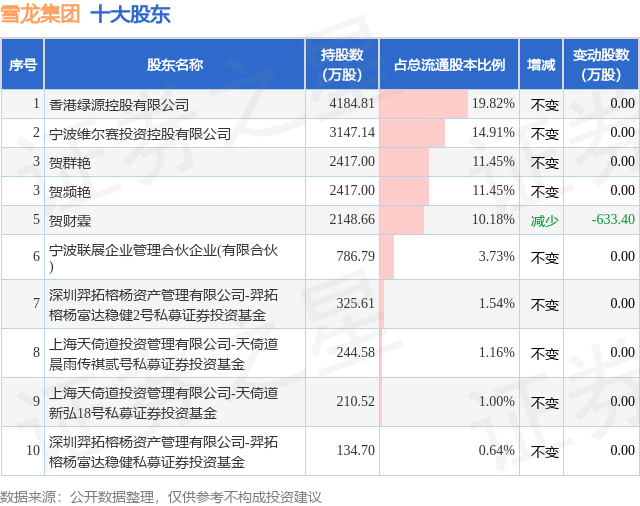 根据雪龙集团2025年三季报公布的十大股东详情如下: