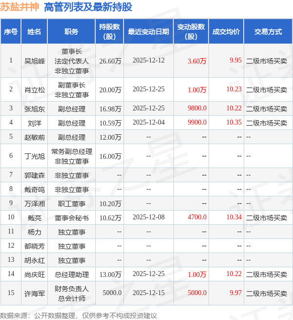 证券之星消息,根据12月25日市场公开信息、上市公司公告及交易所披露数据整理,苏盐井神(603299)最新董监高及相关人员股份变动情况:2025年12月25日公司董事肖立松、高级管理人员张旭东、高级管理人员尚庆旺共增持公司股份2.98万股,占公司总股本为0.0039%。变动期间公司股价上涨0.0%,12月25日当日收盘报10.26元。