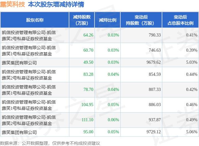 证券之星消息,12月26日露笑科技发布公告《露笑科技:关于持股5%以上股东及其一致行动人减持股份比例触及1%整数倍的公告》,其股东露笑集团有限公司、凯信投资管理有限公司-凯信露笑2号私募证券投资基金、凯信投资管理有限公司-凯信露笑1号私募证券投资基金于2025年12月24日至2025年12月26日间合计减持647.49万股,占公司目前总股本的0.3367%,变动期间该股股价上涨2.85%,截止12月26日收盘报7.93元。