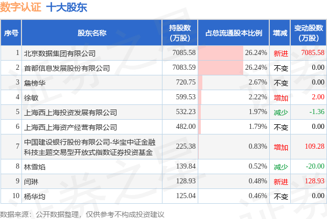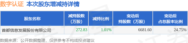 证券之星消息,12月26日数字认证发布公告《数字认证:关于公司大股东减持股份触及1%整数倍的公告》,其股东首都信息发展股份有限公司于2025年12月5日至2025年12月25日间合计减持272.83万股,占公司目前总股本的1.0105%,变动期间该股股价上涨1.0%,截止12月25日收盘报29.38元。