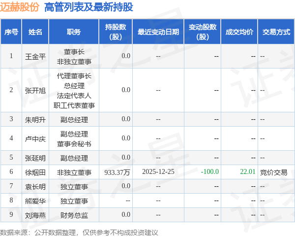 证券之星消息,根据12月26日市场公开信息、上市公司公告及交易所披露数据整理,迈赫股份(301199)最新董监高及相关人员股份变动情况:2025年12月25日公司董事徐烟田共减持公司股份100.0股,占公司总股本为0.0001%。变动期间公司股价上涨6.72%,12月25日当日收盘报23.33元。