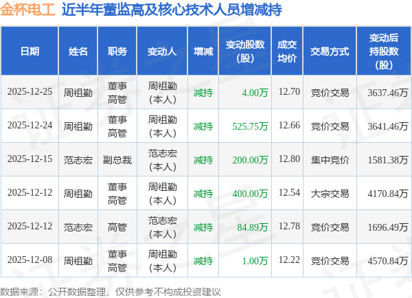 证券之星消息,根据12月26日市场公开信息、上市公司公告及交易所披露数据整理,金杯电工(002533)最新董监高及相关人员股份变动情况:2025年12月25日公司董事,高管周祖勤共减持公司股份4.0万股,占公司总股本为0.0055%。变动期间公司股价上涨0.95%,12月25日当日收盘报12.8元。