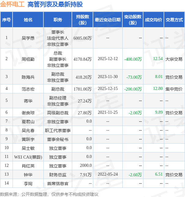 金杯电工近半年内的董监高及核心技术人员增减持详情如下: