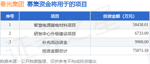 证券之星消息,山东春光科技集团股份有限公司(简称:春光集团)拟在深交所创业板上市,募资总金额为7.51亿元,保荐机构为中国国际金融股份有限公司。募集资金拟用于智慧电源磁电材料项目、研发中心升级建设项目、补充流动资金,详见下表: