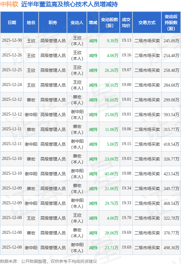中科软近半年内的董监高及核心技术人员增减持详情如下: