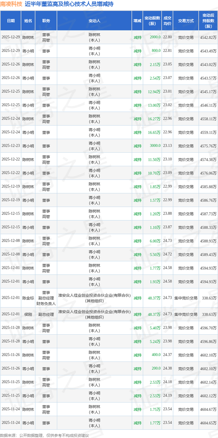 南凌科技近半年内的董监高及核心技术人员增减持详情如下: