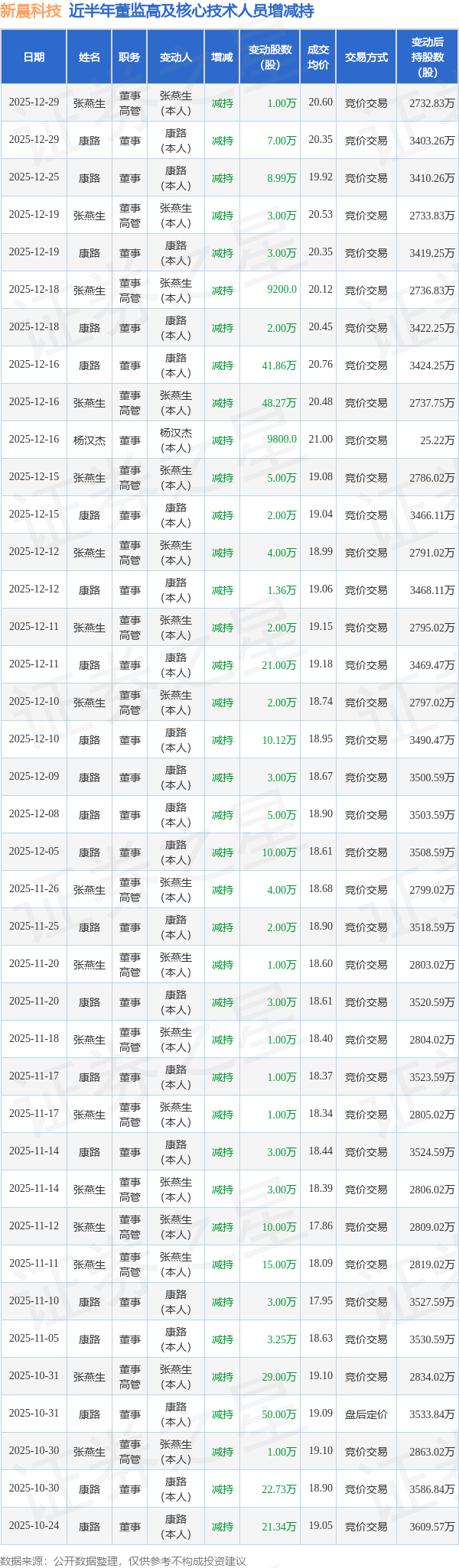 新晨科技近半年内的董监高及核心技术人员增减持详情如下:
