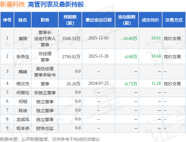 新晨科技的高管列表及最新持股情况如下: