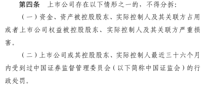 根据证监会发布的《上市公司分拆规则(试行)》有关规定,上市公司或其控股股东、实际控制人最近三十六个月内受到过中国证监会的行政处罚,不得分拆子公司上市。