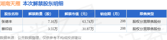 证券之星消息,根据市场公开信息整理,湖南天雁(600698)于1月5日将有10.65万股限售股份解禁,为公司股权分置限售股份,占公司总股本0.01%。(本次数据根据历史公告整理得出,实际情况以上市公司最新公告为准)本次解禁后,公司还有818.6万股限售股份,占总股本0.77%。具体如下图所示: