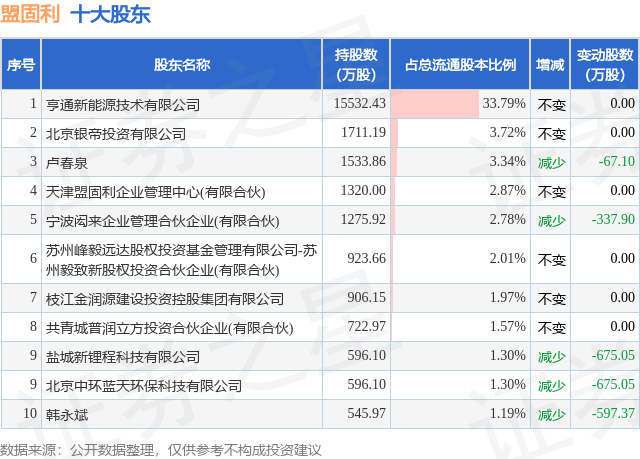 证券之星消息,1月5日盟固利发布公告《盟固利:关于持股5%以上股东减持股份触及1%整数倍的公告》,其股东重庆新锂程企业管理有限公司、北京银帝投资有限公司于2025年12月18日至2025年12月31日间合计减持343.99万股,占公司目前总股本的0.7484%,变动期间该股股价上涨3.39%,截止12月31日收盘报21.93元。