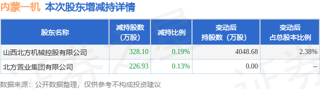 证券之星消息,1月6日内蒙一机发布公告《内蒙一机:内蒙古第一机械集团股份有限公司关于控股股东的一致行动人权益变动触及1%刻度的提示性公告》,其股东北方置业集团有限公司、山西北方机械控股有限公司于2025年11月20日至2026年1月6日间合计减持555.03万股,占公司目前总股本的0.3261%,变动期间该股股价下跌3.74%,截止1月6日收盘报17.5元。