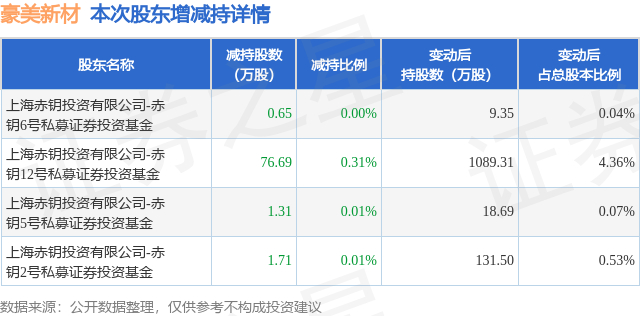 证券之星消息,1月7日豪美新材发布公告《豪美新材:关于持股5%以上股东减持公司股份至5%以下暨权益变动的提示性公告》,其股东上海赤钥投资有限公司-赤钥6号私募证券投资基金、上海赤钥投资有限公司-赤钥12号私募证券投资基金、上海赤钥投资有限公司-赤钥5号私募证券投资基金、上海赤钥投资有限公司-赤钥2号私募证券投资基金于2026年1月5日至2026年1月7日间合计减持80.36万股,占公司目前总股本的0.3216%,变动期间该股股价上涨6.2%,截止1月7日收盘报39.08元。