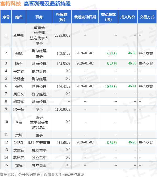 富特科技的高管列表及最新持股情况如下: