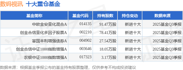 根据2025基金Q3季报公募基金重仓股数据,重仓该股的公募基金共5家,其中持有数量最多的公募基金为中欧基金的中欧金安量化混合A。中欧金安量化混合A目前规模为4.93亿元,最新净值1.4166(1月9日),较上一交易日上涨1.59%,近一年上涨56.63%。该公募基金现任基金经理为曲径 宋婷。曲径在任的基金产品包括:中欧数据挖掘多因子混合A,管理时间为2016年1月13日至今,期间收益率为216.93%;中欧量化驱动混合A,管理时间为2018年5月16日至今,期间收益率为90.73%;中欧量化先锋混合A,管理时间为2022年2月16日至今,期间收益率为8.85%。宋婷在任的基金产品包括:中欧中证500指数增强A,管理时间为2025年2月21日至今,期间收益率为45.5%;中欧中证1000指数增强A,管理时间为2025年6月5日至今,期间收益率为38.39%;中欧国证2000指数增强A,管理时间为2025年6月17日至今,期间收益率为27.86%。