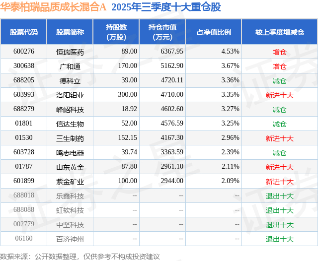 华泰柏瑞品质成长混合A的前十大重仓股如下: