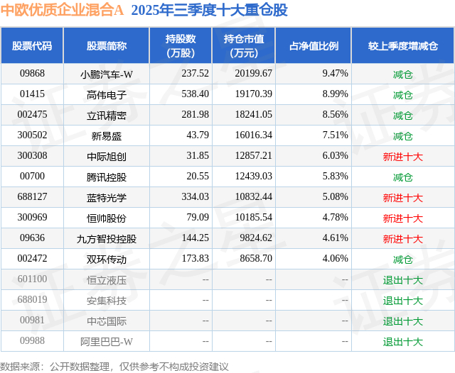 根据2025基金Q3季报公募基金重仓股数据,重仓该股的公募基金共9家,其中持有数量最多的公募基金为中欧基金的中欧优质企业混合A。中欧优质企业混合A目前规模为20.06亿元,最新净值1.4126(1月15日),较上一交易日上涨2.06%,近一年上涨63.48%。该公募基金现任基金经理为代云锋。代云锋在任的基金产品包括:中欧洞见一年持有混合,管理时间为2022年7月7日至今,期间收益率为30.25%;中欧科技成长混合A,管理时间为2024年2月2日至今,期间收益率为108.92%。
