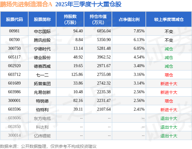 鹏扬先进制造混合A的前十大重仓股如下: