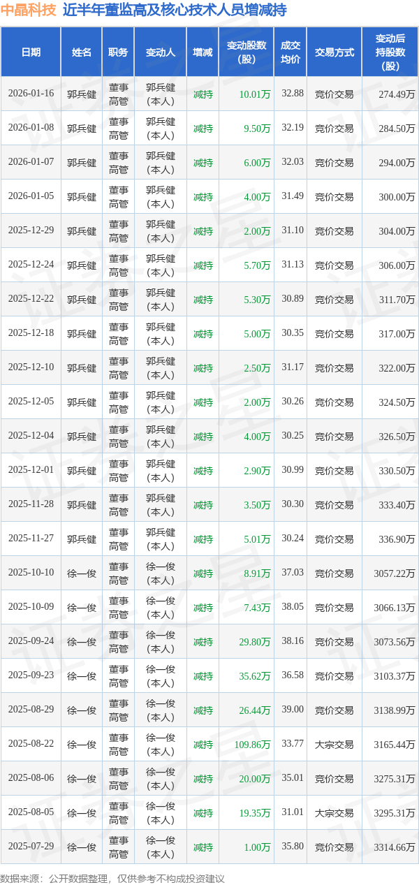 中晶科技近半年内的董监高及核心技术人员增减持详情如下: