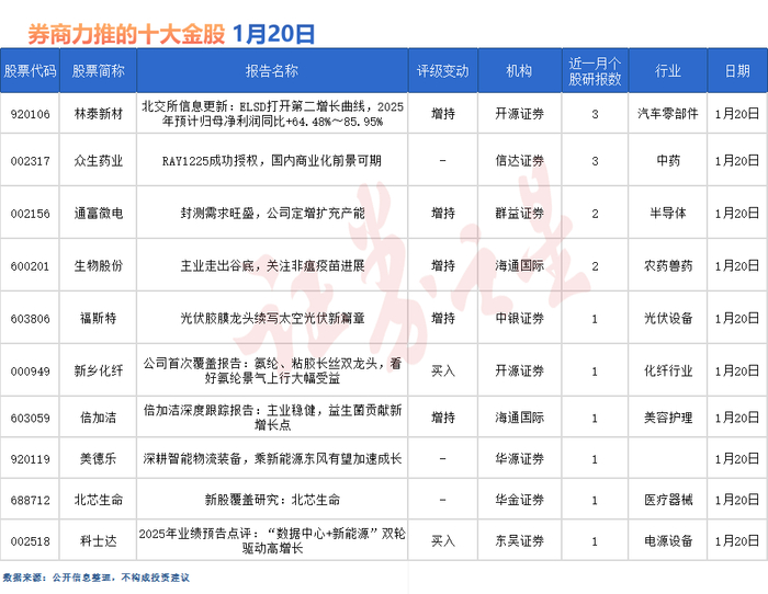 林泰新材最受券商关注,近一个月获东吴证券、中邮证券等3份券商研报关注,位居1月20日券商力推股榜首。