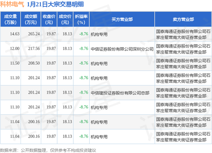证券之星消息,1月21日科林电气发生大宗交易,交易数据如下:
