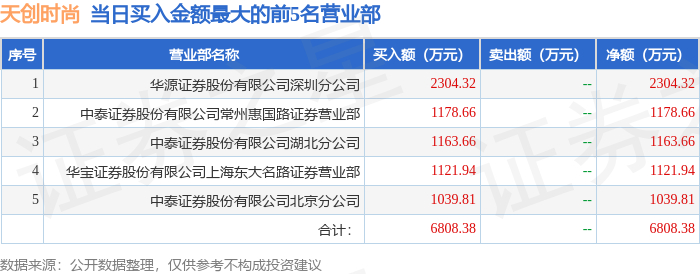 证券之星消息,沪深交易所2026年1月21日公布的交易公开信息显示,天创时尚(603608)因有价格涨跌幅限制的日收盘价格涨幅偏离值达到7%的前五只证券登上龙虎榜。此次是近5个交易日内第1次上榜。