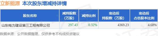 证券之星消息,1月21日立新能源发布公告《立新能源:新疆立新能源股份有限公司关于公司股东减持股份计划完成的公告》,其股东山东电力建设第三工程有限公司于2026年1月13日至2026年1月20日间合计减持297.43万股,占公司目前总股本的0.3187%,变动期间该股股价上涨4.99%,截止1月20日收盘报7.78元。