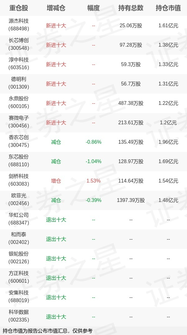 证券之星消息,1月22日广发基金旗下罗国庆管理的广发中证1000交易型开放式指数基金公布年报,近1年净值增长率41.12%。与上一季度相比,该基金前十大重仓股新增源杰科技,长芯博创,淳中科技,德明利,永鼎股份,赛微电子;其中香农芯创持仓占比0.55%,为该基金第一大重仓股;华虹公司,和而泰,银轮股份,方正科技,安集科技,科华数据等退出前十大重仓股;详细数据如下: