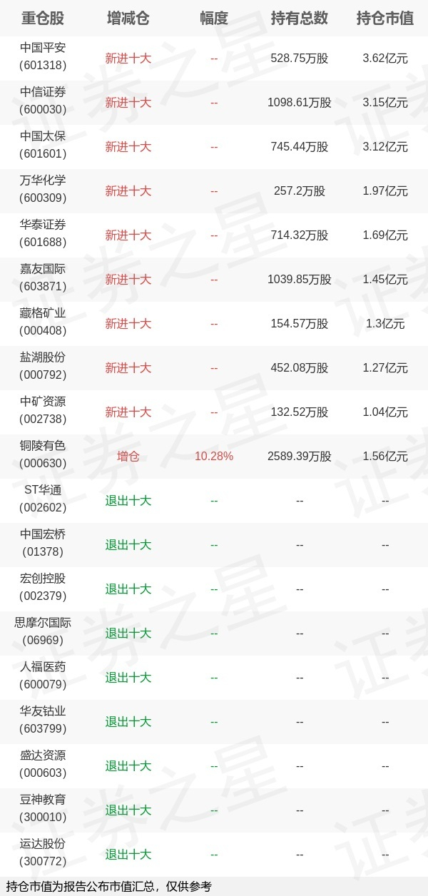 证券之星消息,1月22日博时基金旗下张李陵 江海峰管理的博时恒乐债券型基金公布年报,近1年净值增长率9.13%。与上一季度相比,该基金前十大重仓股新增中国平安,中信证券,中国太保,万华化学,华泰证券,嘉友国际,藏格矿业,盐湖股份,中矿资源;其中中国平安持仓占比1.48%,为该基金第一大重仓股;ST华通,中国宏桥,宏创控股,思摩尔国际,人福医药,华友钴业,盛达资源,豆神教育,运达股份等退出前十大重仓股;详细数据如下: