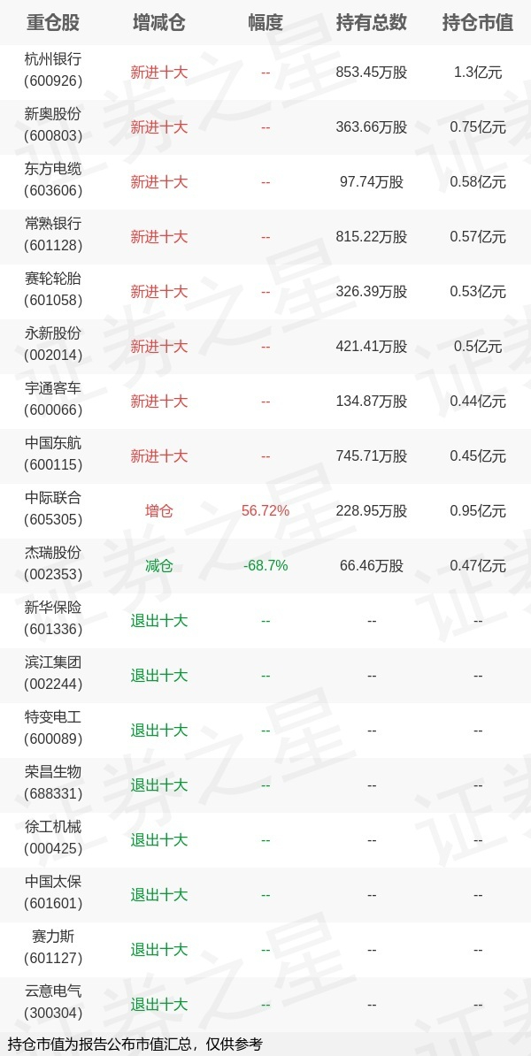 证券之星消息,1月22日广发基金旗下刘志辉管理的广发集源债券型基金公布年报,近1年净值增长率6.39%。与上一季度相比,该基金前十大重仓股新增杭州银行,新奥股份,东方电缆,常熟银行,赛轮轮胎,永新股份,宇通客车,中国东航;其中杭州银行持仓占比1.05%,为该基金第一大重仓股;新华保险,滨江集团,特变电工,荣昌生物,徐工机械,中国太保,赛力斯,云意电气等退出前十大重仓股;详细数据如下: