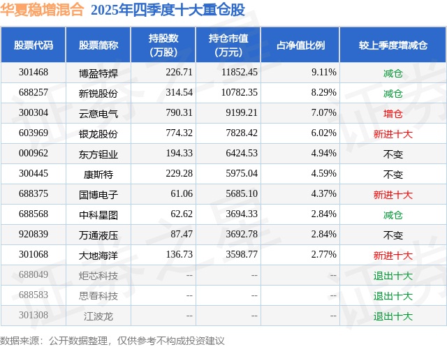 根据2025基金年报公募基金重仓股数据,重仓该股的公募基金共3家,其中持有数量最多的公募基金为华夏基金的华夏稳增混合。华夏稳增混合目前规模为13.01亿元,最新净值4.354(1月22日),较上一交易日上涨0.58%,近一年上涨77.06%。该公募基金现任基金经理为彭海伟。彭海伟在任的基金产品包括:华夏景气成长一年持有混合发起式A,管理时间为2024年3月28日至今,期间收益率为79.42%;华夏行业混合(LOF),管理时间为2026年1月13日至今,期间收益率为2.97%。