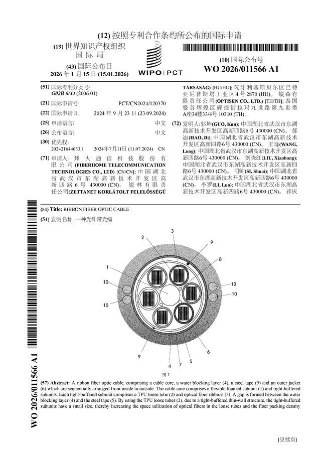 证券之星消息,根据企查查数据显示烽火通信(600498)公布了一项国际专利申请,专利名为“一种光纤带光缆”,专利申请号为PCT/CN2024/120370,国际公布日为2026年1月15日。