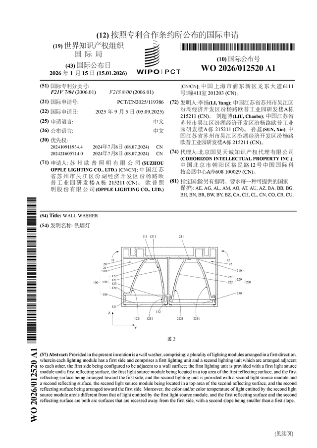 证券之星消息,根据企查查数据显示欧普照明(603515)公布了一项国际专利申请,专利名为“洗墙灯”,专利申请号为PCT/CN2025/119386,国际公布日为2026年1月15日。