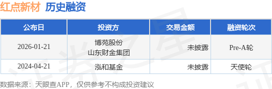 证券之星消息,根据天眼查APP于1月21日公布的信息整理,山东红点新材料有限公司Pre-A轮融资,融资额未披露,参与投资的机构包括博苑股份,山东财金集团。