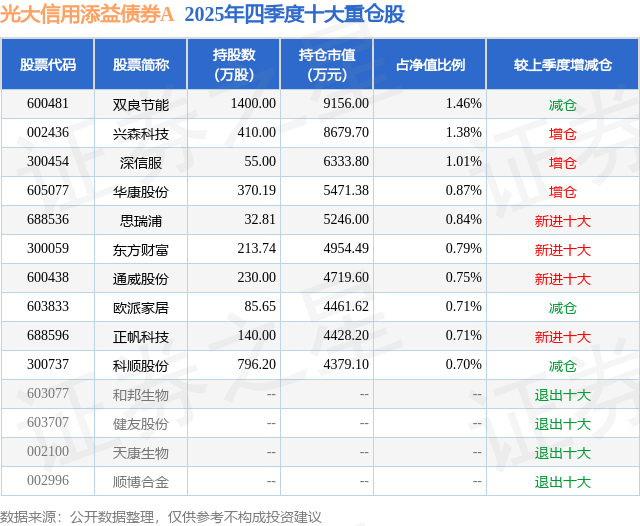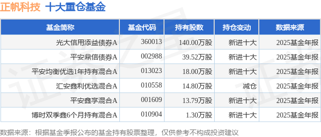 根据2025基金年报公募基金重仓股数据,重仓该股的公募基金共6家,其中持有数量最多的公募基金为光大保德信基金的光大信用添益债券A。光大信用添益债券A目前规模为54.29亿元,最新净值1.372(1月23日),较上一交易日上涨1.63%,近一年上涨32.56%。该公募基金现任基金经理为黄波。黄波在任的基金产品包括:光大中高等级债券A,管理时间为2019年10月9日至今,期间收益率为77.28%;光大安祺债券A,管理时间为2019年10月9日至今,期间收益率为34.73%;光大增利收益债券A,管理时间为2019年10月9日至今,期间收益率为47.86%;
