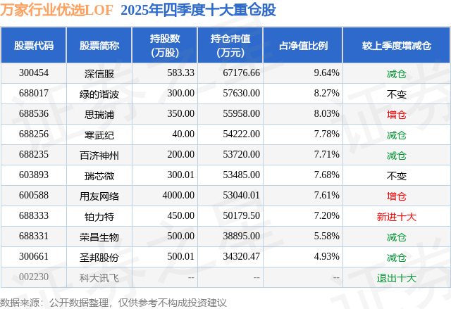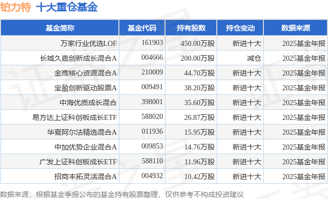 根据2025基金年报公募基金重仓股数据,重仓该股的公募基金共43家,其中持有数量最多的公募基金为万家基金的万家行业优选LOF。万家行业优选LOF目前规模为69.68亿元,最新净值1.5549(1月23日),较上一交易日上涨1.0%,近一年上涨63.62%。该公募基金现任基金经理为黄兴亮。黄兴亮在任的基金产品包括:万家经济新动能混合A,管理时间为2019年10月30日至今,期间收益率为101.85%;万家自主创新混合A,管理时间为2020年2月10日至今,期间收益率为37.75%;万家创业板2年定期开放混合C,管理时间为2020年8月14日至今,期间收益率为-11.99%。